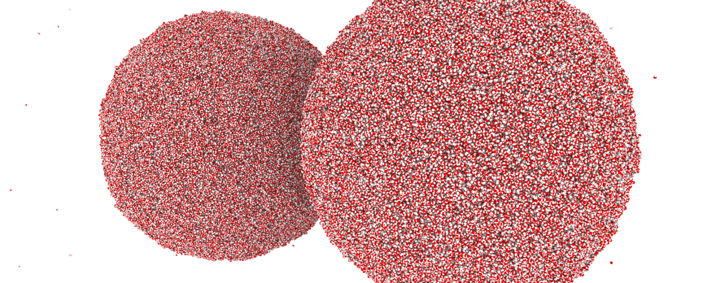 Off-centre coalescence of liquid nanodrops seen in MD.