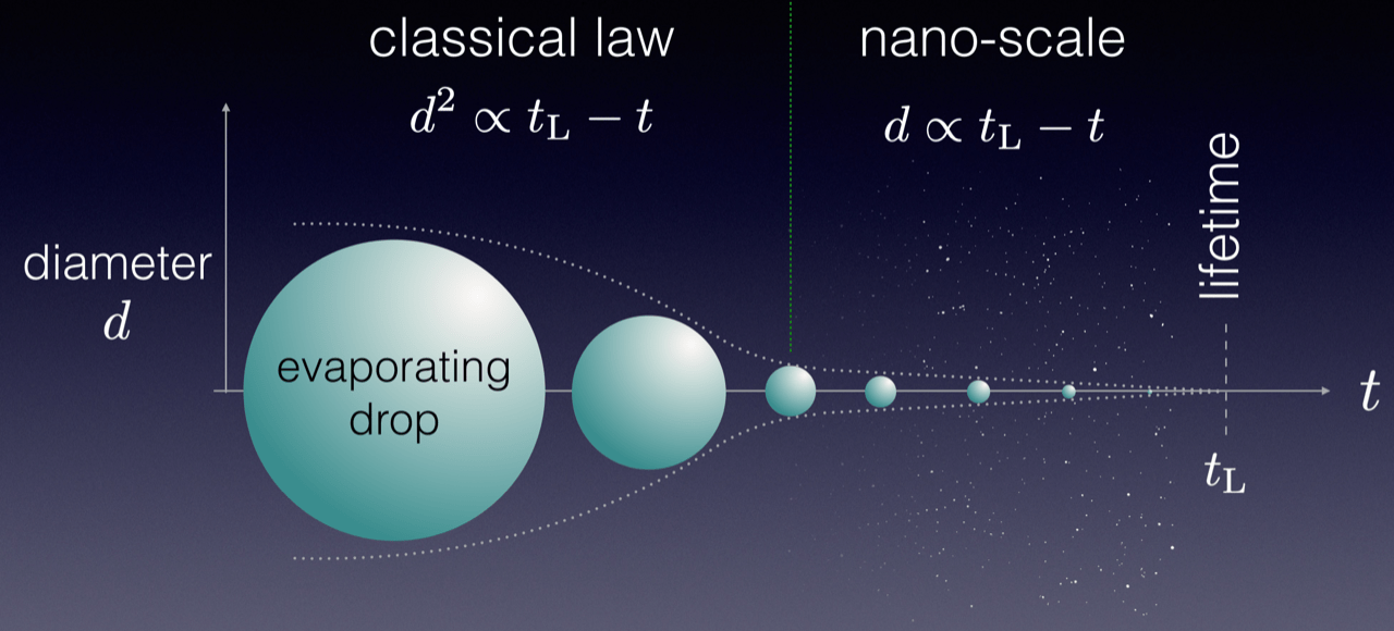 This appears simple to answer, as when the drop is large, a classical law dictates that its diameter-squared decreases in proportion to time; however, this period only accounts for a small portion of the drop’s evolution. As the diameter approaches the unobservable micro- and nano-scale, molecular dynamics have to be used as virtual experiments and these show a crossover to a new behaviour, with the diameter now reducing in proportion to time (the nano-scale law).